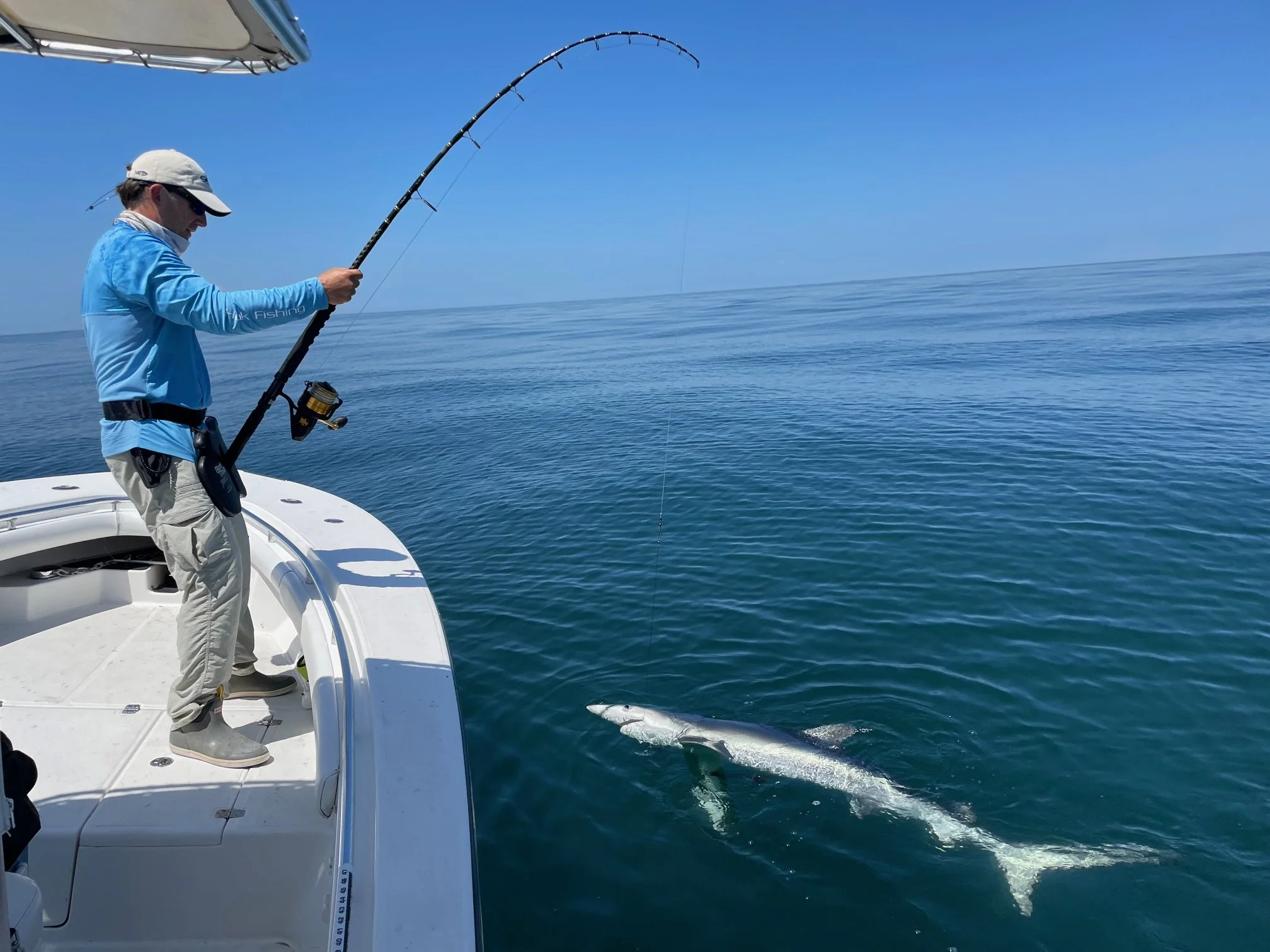 Offshore Sharks involve gathering bait early morning then running offshore to set up a chum slick. Will fish both live and cut bait and well as Fly. Makos and Blue Sharks are common, Porbeagles and Threshers vary by location, Hammers and Sandbar sharks possible through summer.